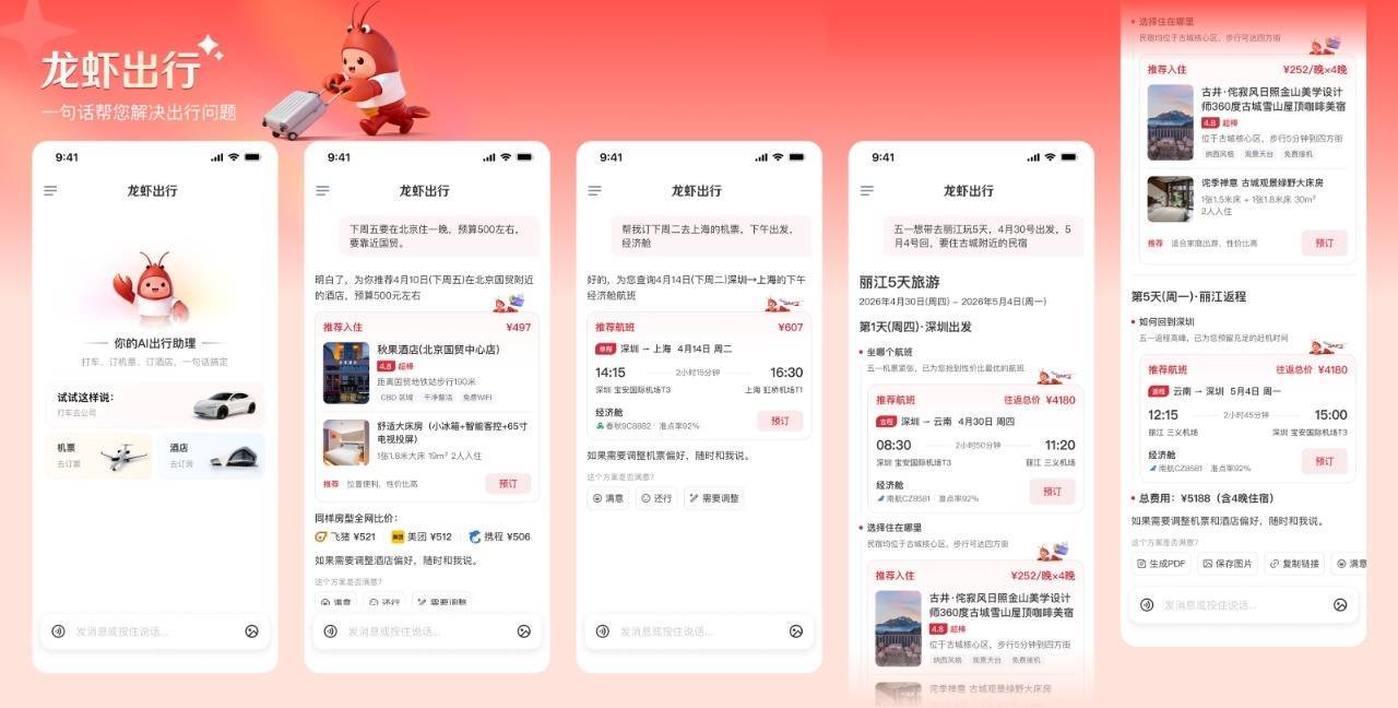 基于“Sage”多智能体协作平台,“龙虾出行”推出针对出行行业垂直领域的Skills,用户可一键配置安装。“龙虾出行”Skills与产品展现出三大核心优势:一是省钱省心,全网比价、全网最低。除了实现“一句话”打车、订机票、订酒店之外,为用户挑选最具性价比的出行服务,大幅降低出行的成本;二是智能匹配,基于用户历史偏好、实时路况、运力分布等多维数据,精准推荐最优服务供应商,让出行更智能;三是全链路自动化,从预约、行程管理到费用结算,全程无需人工干预,真正解放用户双手。